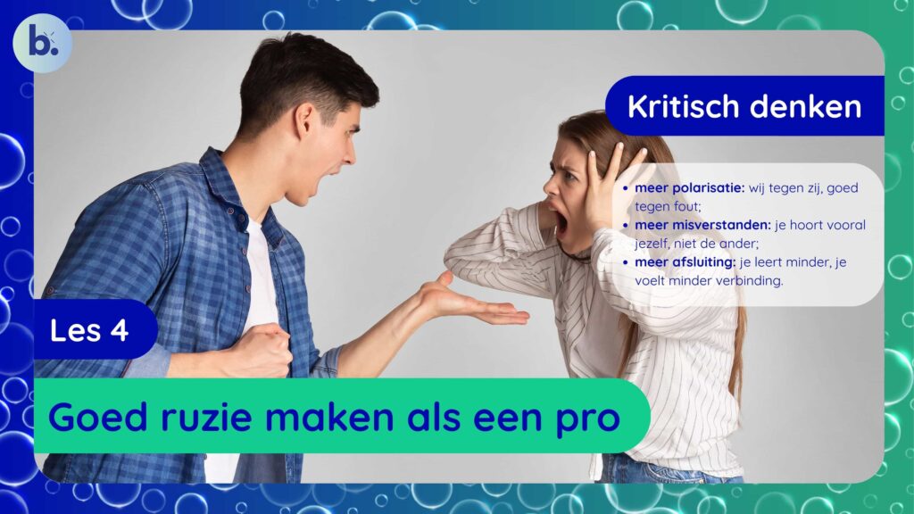In deze les oefenen leerlingen met het voeren van een goed gesprek in situaties van meningsverschil of conflict. Ze ontdekken hoe ruzies vaak vastlopen doordat we elkaar reduceren tot één standpunt of stereotype en hoe het gesprek open kan blijven als je durft te luisteren, te vertragen en zelfs jezelf te heroverwegen.